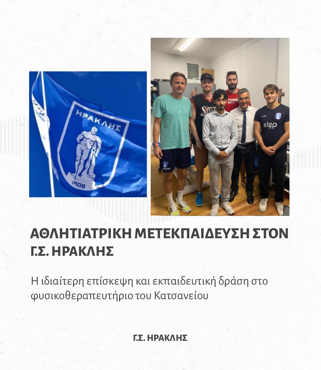 Στα πλαίσια της διδακτικής ιδιότητας του επικεφαλής Ορθοπαιδικού του Γ.Σ. ΗΡΑΚΛΗΣ, Αλασεϊρλή Δήμου, ο Βρετανός μεταπτυχιακός ιατρός του Πανεπιστημίου του Λονδίνου Queen Mary, Dr Hewed Said, επισκέφθηκε τον χώρο Φυσιοθεραπευτικής Αποκατάστασης στο Κατσάνειο, για να παρακολουθήσει θέματα κλινικής εκτίμησης από τον κ. Αλασεϊρλή και αποκατάστασης αθλητικών κακωσεων από τον Φυσιοθεραπευτή του Συλλόγου κ. Παναγιώτη Ναβροζίδη.